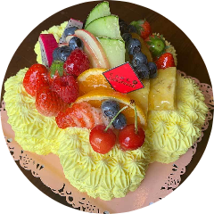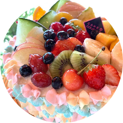 カラフルな生クリームで周りをデコレーションして、フルーツが沢山飾ってあります。※生クリームの色は写真と異なる場合がございます。