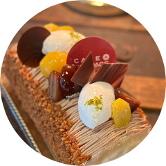 プレーン生地に生クリームと黄栗の甘露煮を巻き、洋栗ペーストをかけて仕上げました。