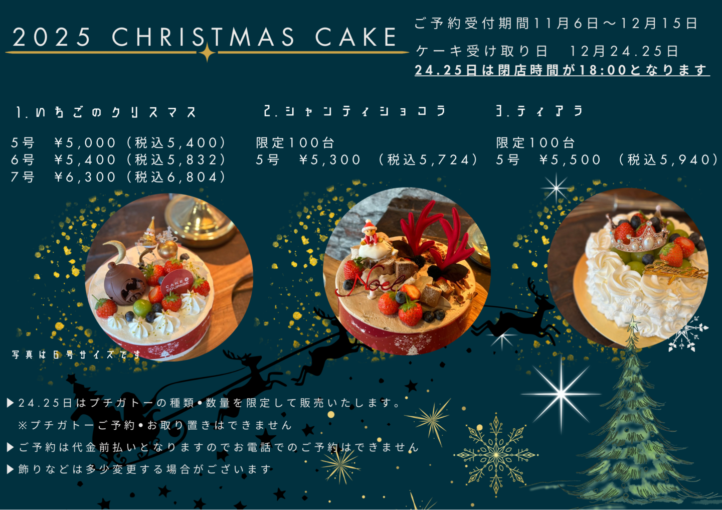 11月6日~12月15日 ケーキ受け取り日 12月24・25日 24・25日は閉店時間が18時となります。 |